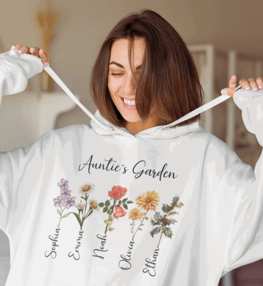 Custom Birthflower Hoodie â Auntie âs Garden & Family Names - Unisex Hooded Sweatshirt