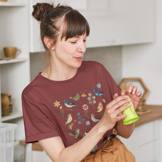 Cottagecore Birds and Flowers Shirt, Folk Art Scandi Art T Shirt, Boho Floral & Birds Graphic T-Shirt
